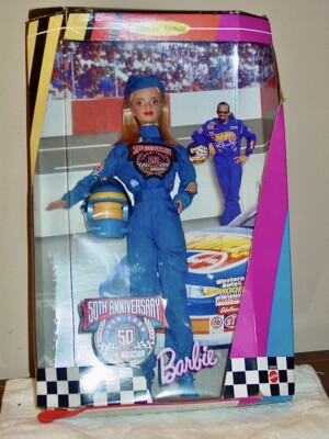 I purchased this nascar 50th anniversary barbie for my 8 year old daughter for this past christmas 2011, and i was very pleased with this item. 50th anniversary nascar 1998 barbie doll приобрести. Brown hair blue eyes nascar barbie doll uniform shoes hat earrings. 50th anniversary nascar barbie doll 20442 barbie signature. Clad in a blue jumpsuit, nascar barbie's outfit is accurate right down to the sponsor.
