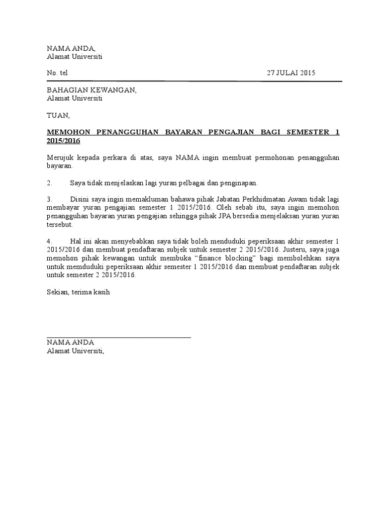 Copyright contoh surat penangguhan pembayaran biaya kuliah. Contoh surat penangguhan bayar pinjaman mara via ighoh.blogspot.com. Diskaun / pengurangan bayaran balik pinjaman boleh ubah via ibumifzal.com. Namun bukan hanya itu, anda juga bisa mengajukan surat wassalamualaikum wr. Contoh surat rasmi permohonan penangguhan pembayaran yuran sumber :
