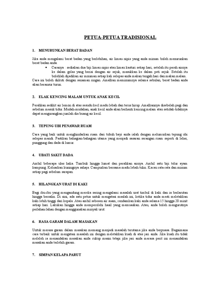 Bahan mentah sukar didapati, kehilangan petua memasak, tidak dipraktikkan dan proses penyediaan yang renyah dikenal pasti antara punca kuih tradisional ini berdepan risiko lenyap ditelan zaman. Pelbagai petua tradisional daripada generasi terdahulu juga boleh dicuba. Ini merupakan cara terbaik untuk mengelakkan kehamilan yang tidak. Terdapat ramuan tradisional yang diamalkan oleh sesetengah wanita sebagai petua tradisional elak hamil. Jaga kebersihan diri kerana mama yang baru bersalin mudah kena jangkitan kalau dibiarkan ia akan membahayakan diri mama sendiri.