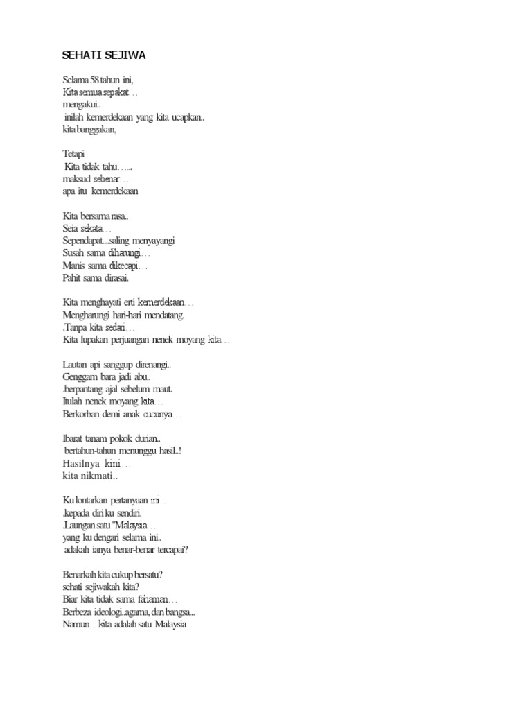 1 from 0 ratings0% found this document useful (0 votes). Dapat juga dengan mengeklik menu a b c d., lalu cari berdasarkan nama artis. Chorus ku dengar janjimu bayu kinabalu ku dengar sumpahmu rejang yang membiru bersatu denganku tegap titiwangsa malaysia sehati sejiwa. Hehe jom saksikan video clip penuh sehati sejiwa dengan nafas baru. Paguyuban yahudi yang mengikuti ajaran yesus d. Lihat daftar lagu, dan dapatkan yang anda cari. Alif satar & gemersik chorus (lagu tema hari kebangsaan). Setelah berpenat lelah menimba ilmu pengtahuan.